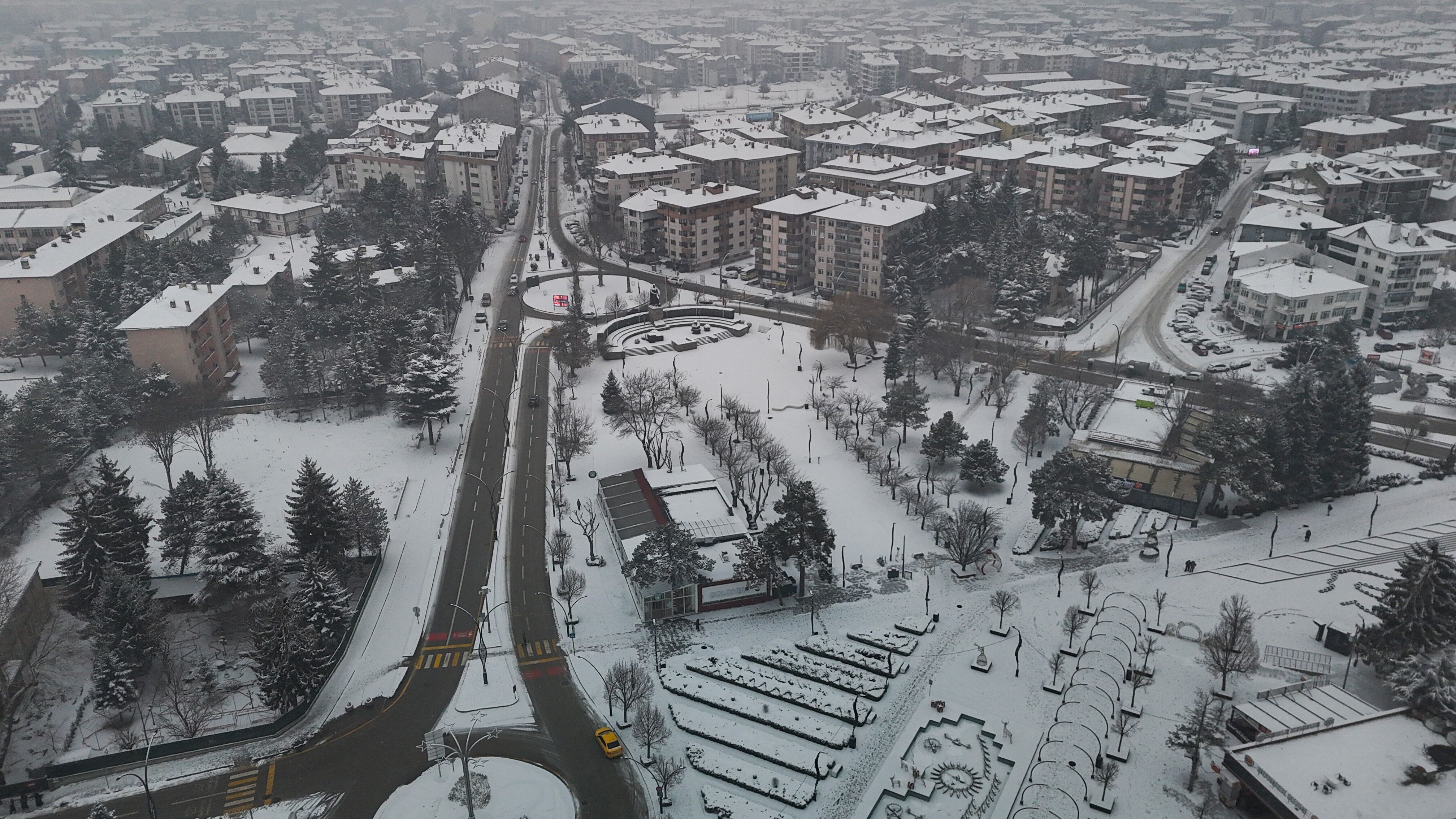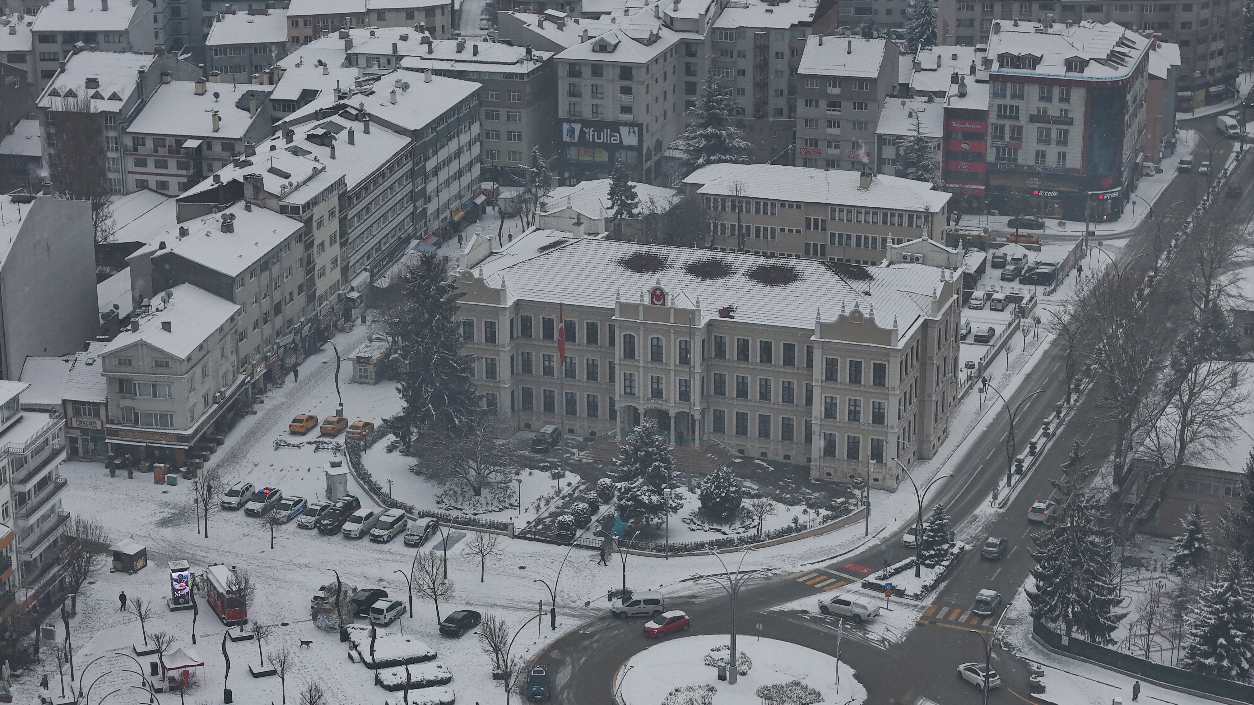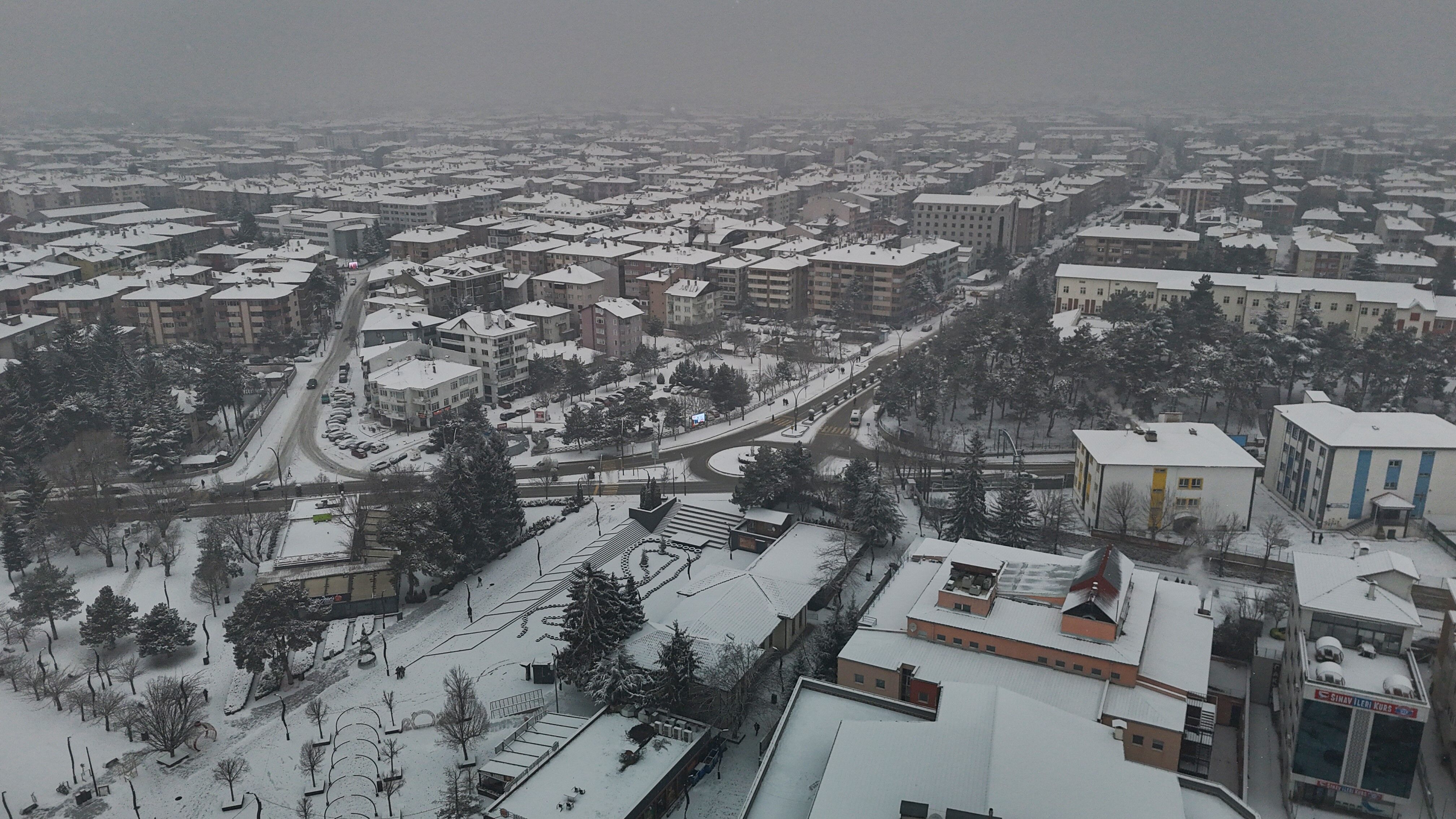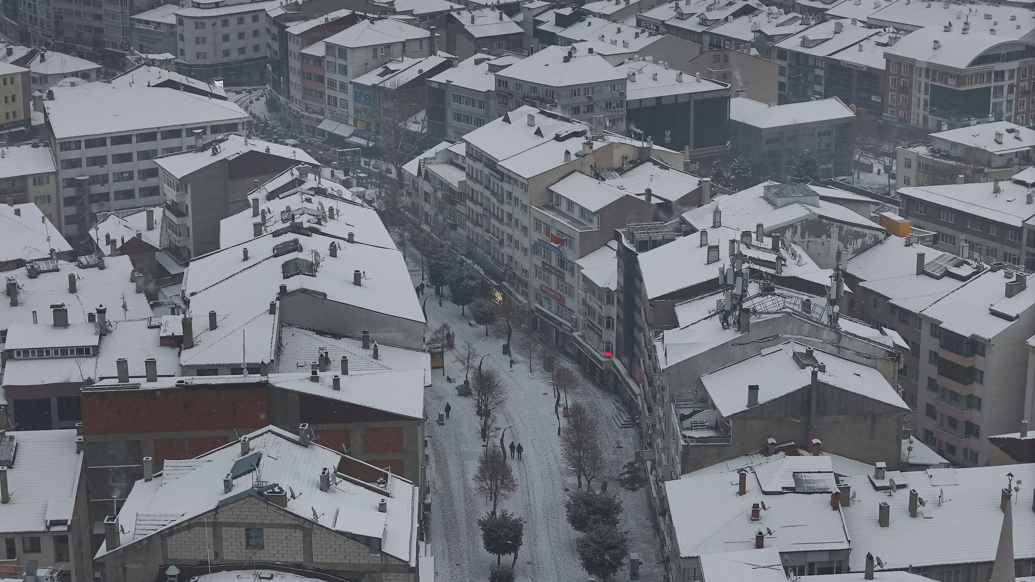 Bolu'da, soğuk havanın etkisiyle birlikte sabah saatlerinde başlayan kar yağışı aralıklarla etkili olmaya devam ediyor. Yağışla birlikte şehir merkezi kısa sürede beyaza büründü. Kentin üzerini kaplayan beyaz örtü, kartpostallık manzaralar oluşturdu. Binaların çatıları, parklar ve yeşil alanlar karla kaplanırken, yağışın oluşturduğu görsel şölen dron ile görüntülendi.