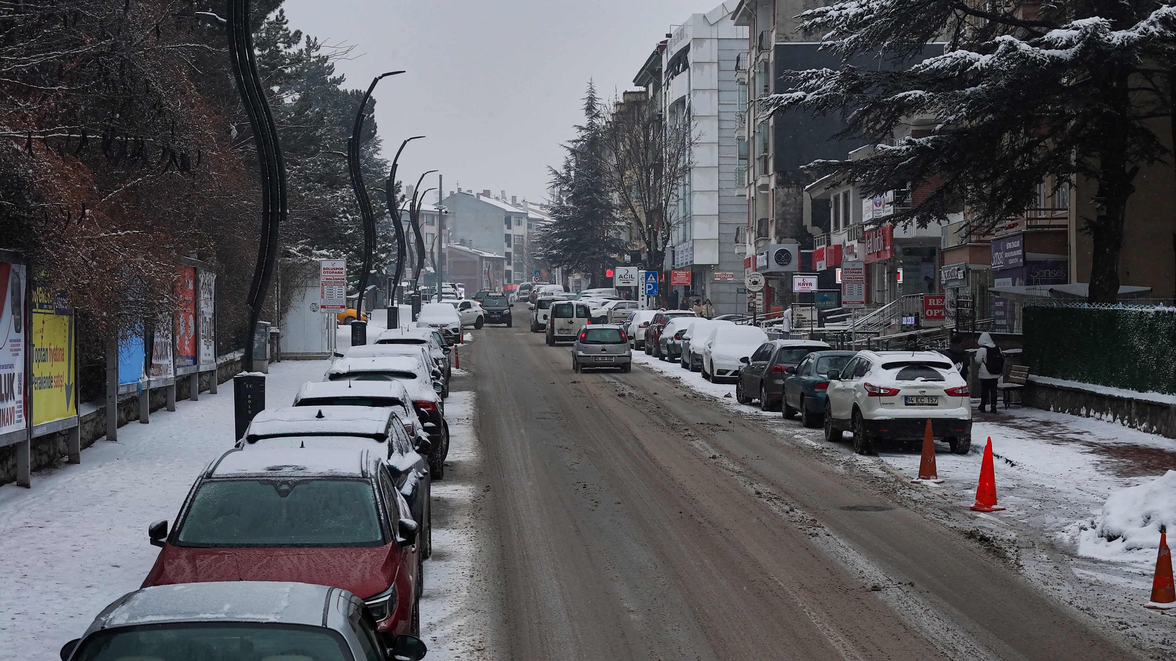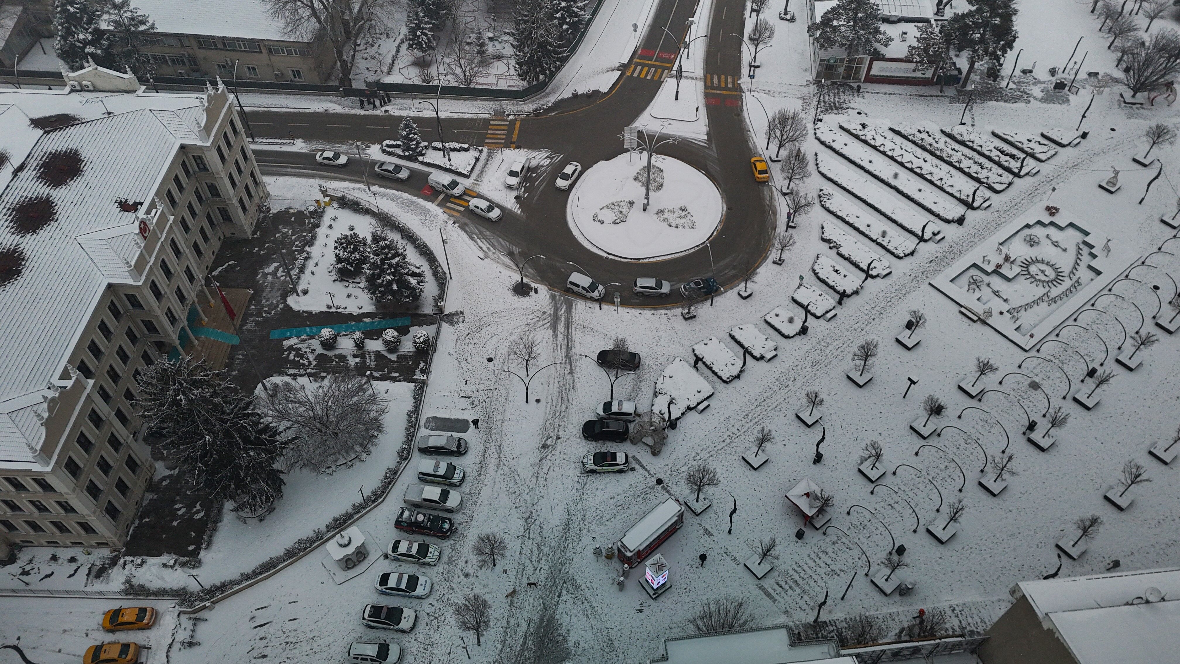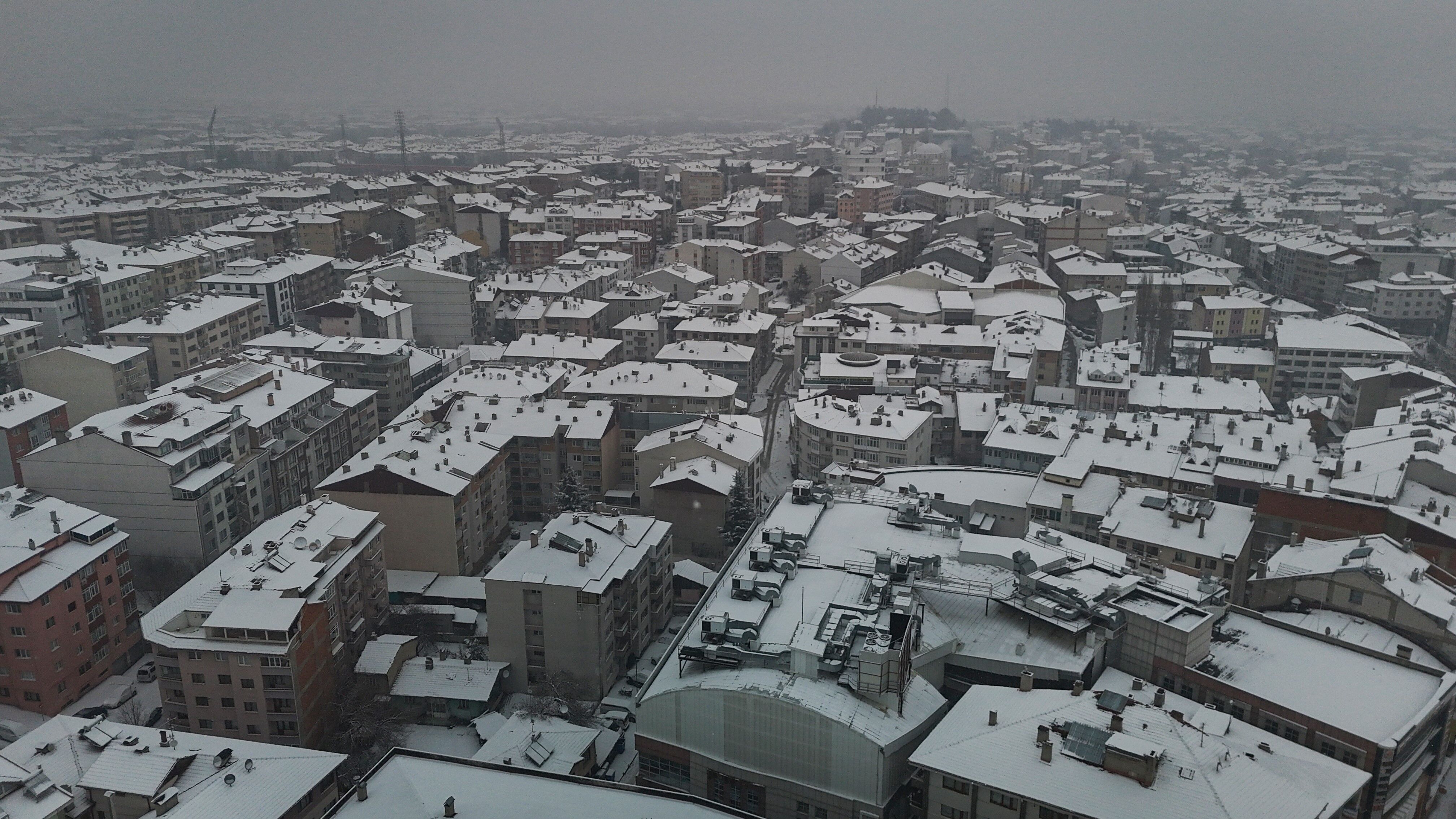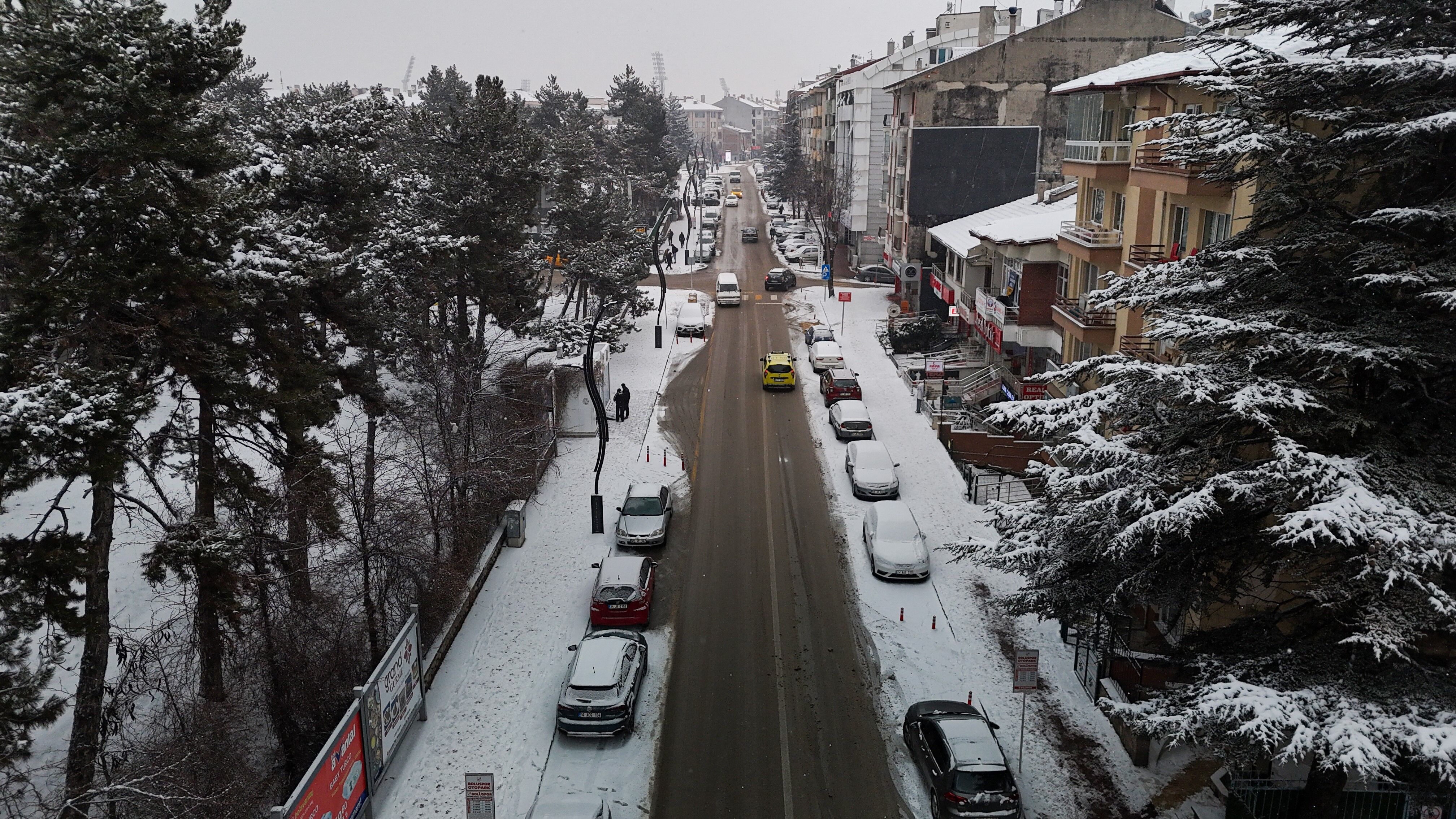 Bolu'da, soğuk havanın etkisiyle birlikte sabah saatlerinde başlayan kar yağışı aralıklarla etkili olmaya devam ediyor. Yağışla birlikte şehir merkezi kısa sürede beyaza büründü. Kentin üzerini kaplayan beyaz örtü, kartpostallık manzaralar oluşturdu. Binaların çatıları, parklar ve yeşil alanlar karla kaplanırken, yağışın oluşturduğu görsel şölen dron ile görüntülendi.