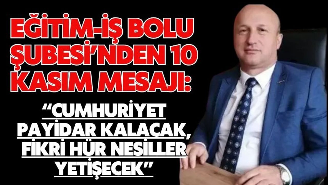 Eğitim-İş Bolu Şube Başkanı Erkan Korkmaz, 10 Kasım Atatürk’ü Anma Günü dolayısıyla yaptığı açıklamada, Mustafa Kemal Atatürk’ün devrimlerinin çağları aşan bir yol gösterici olduğunu belirterek, “Cumhuriyetimizin bağımsızlığını, egemenliğini, laikliği, kamusal eğitim hakkını ve emeğin onurunu savunmaya devam edeceğiz” dedi.