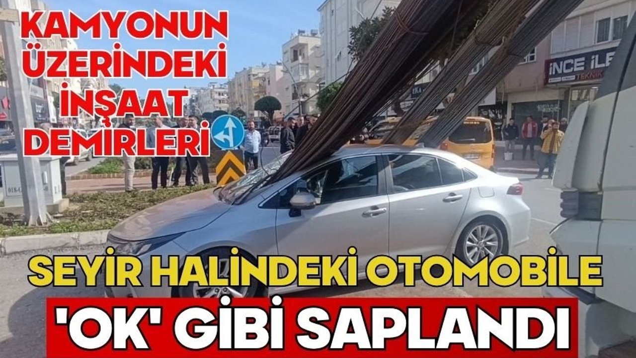 Kamyonun üzerindeki inşaat demirleri seyir halindeki otomobile 'ok' gibi saplandı