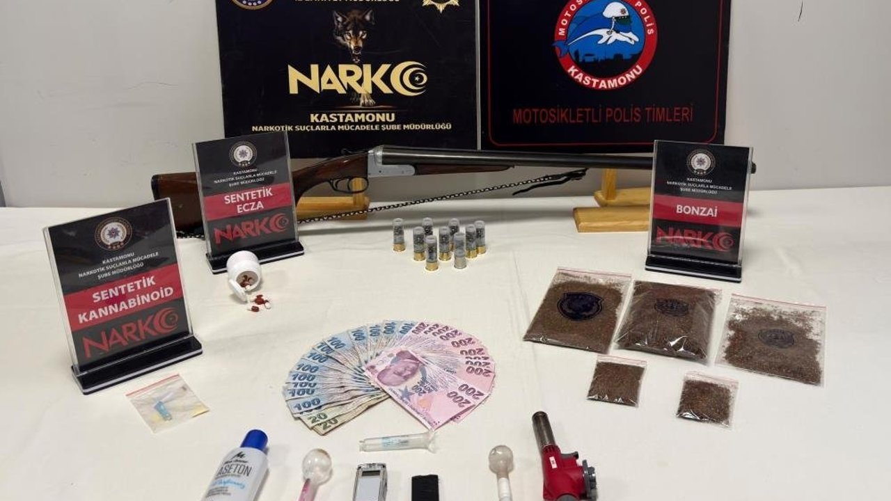 Edinilen bilgiye göre, Kastamonu İl Emniyet Müdürlüğü Narkotik Suçlarla Mücadele Şube Müdürlüğü ile Asayiş Şube Müdürlüğüne bağlı Motosikletli Polis Timleri tarafından gerçekleştirilen 2 farklı uyuşturucu operasyonunda, 114,20 gram bonzai, 0,83 gram A.M. bonzai ham maddesi, 10 adet sentetik ecza hapı, 1 adet hassas terazi, 3 adet uyuşturucu madde kullanımında kullanılan cam düzenek, uyuşturucu madde seyreltmede kullanılan 120 mililitre aseton, 1 adet ruhsatsız yivsiz av tüfeği ve bu tüfeğe ait 9 adet kartuş, 2 adet tarihi eser niteliği taşıyan obje, suçtan elde edildiği değerlendirilen 5 bin 595 TL para ele geçirildi.