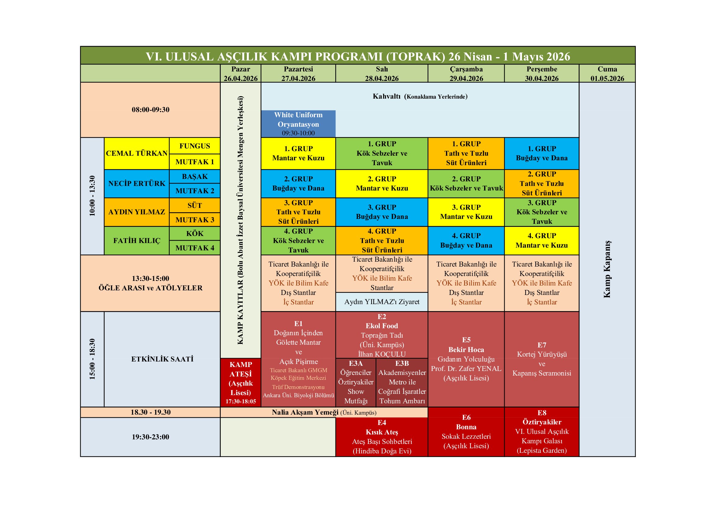 VI. Ulusal Aşçılık Kampı’nın açılış programı 27 Nisan 2026 Pazartesi günü saat 12.00’de Bolu Abant İzzet Baysal Üniversitesi Mengen Kampüsü’nde gerçekleştirilecek. Açılışın ardından kamp boyunca çeşitli akademik ve sektörel oturumlar katılımcılarla buluşacak.