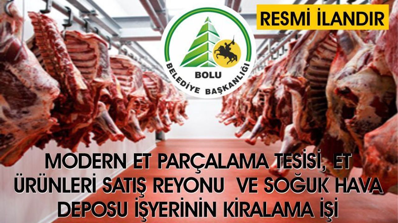 1. Mülkiyeti Bolu Belediyesine ait olan Aktaş Mah. Akıncı Sk. No:119/A ve 119/B (Karaçayır Mah. 229 Ada 11 Parsel) adresindeki Modern Et Parçalama Tesisi, Et Ürünleri Satış Reyonu ve Soğuk Hava Deposu işyerinin kiralama işi; 2886 sayılı Devlet İhale Kanununun 35/c maddesi uyarınca Açık Teklif Usulü ile 10(on) yıllığına kiraya verilecektir.
