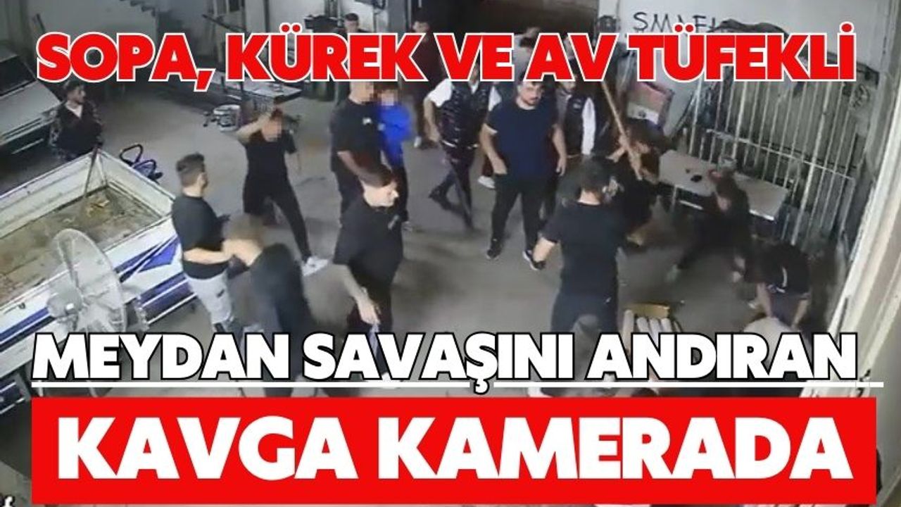 Bir iş yerine gelen çoğu çocuk yaştakilerden oluşan grubun, iş yeri sahibi iki kardeş ile sopa, kürek ve tüfekle meydan savaşını andıran kavga anı güvenlik kamerasına yansıdı.
