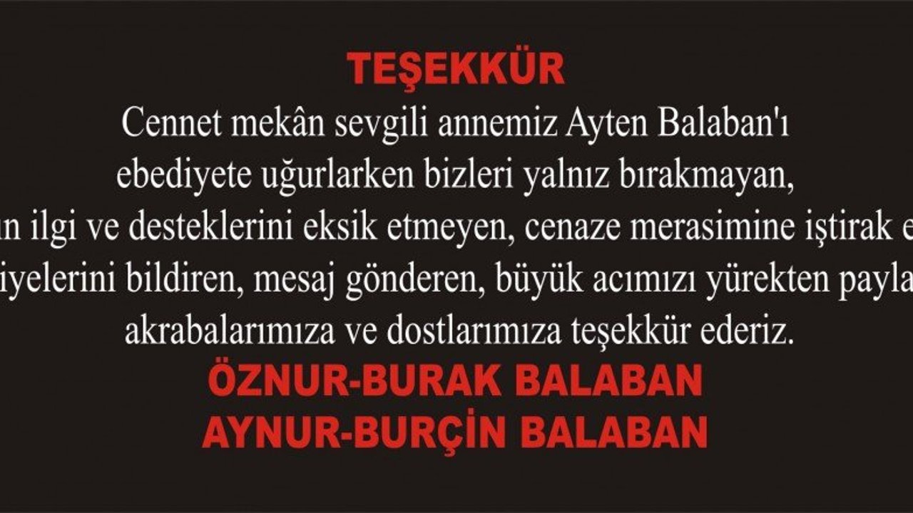 Cennet mekân sevgili annemiz Ayten Balaban’ı ebediyete uğurlarken bizleri yalnız bırakmayan, yakın ilgi ve desteklerini eksik etmeyen, cenaze merasimine iştirak eden, taziyelerini bildiren, mesaj gönderen, büyük acımızı yürekten paylaşan akrabalarımıza ve dostlarımıza teşekkür ederiz.