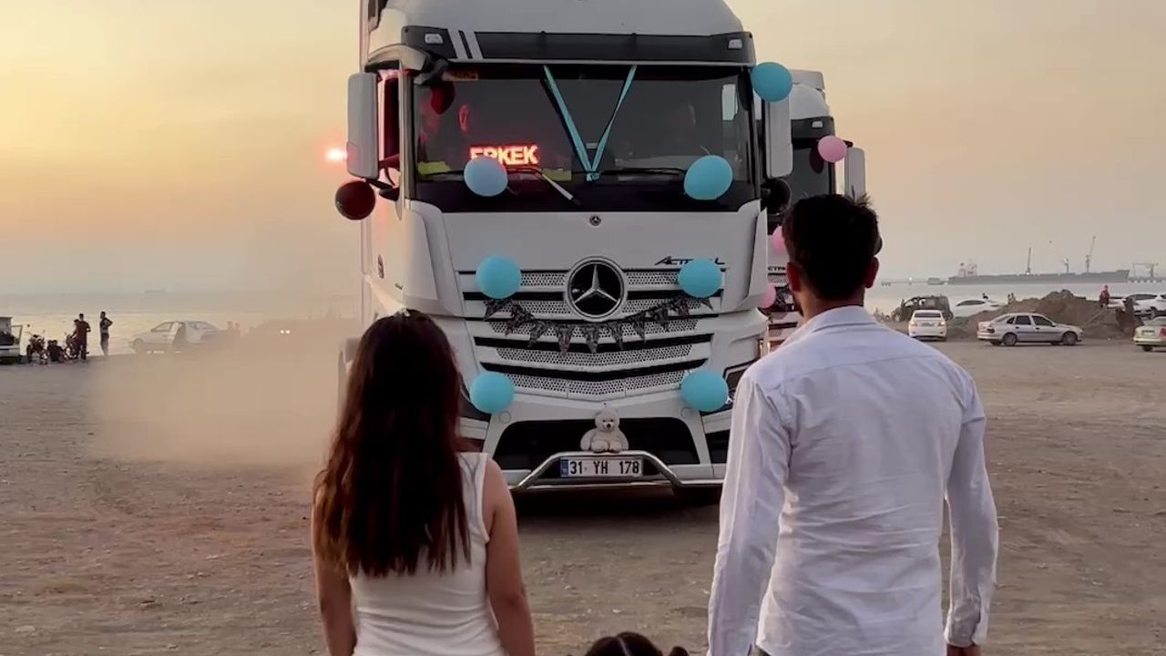 Hatay'da tır şoförlüğü yapan Caner Çevik, ikinci kez baba olmanın heyecanını farklı bir organizasyonla unutulmaz hale getirdi. Tır şoförünün meslektaşları, tırlarla parti düzenleyerek aileye evlatlarının cinsiyetini açıkladı.
