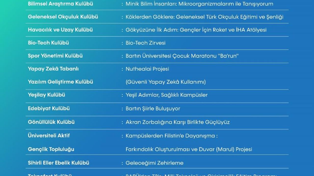 Geleneksel Okçuluk Kulübü "Köklerden Göklere: Geleneksel Türk Okçuluk Eğitimi ve Şenliği", Spor Yönetimi Kulübü "Bartın Üniversitesi Çocuk Maratonu Ba'run", Yeşilay Kulübü "Yeşil Adımlar, Sağlıklı Kampüsler" projeleriyle listede yer alma başarısı gösterdi.